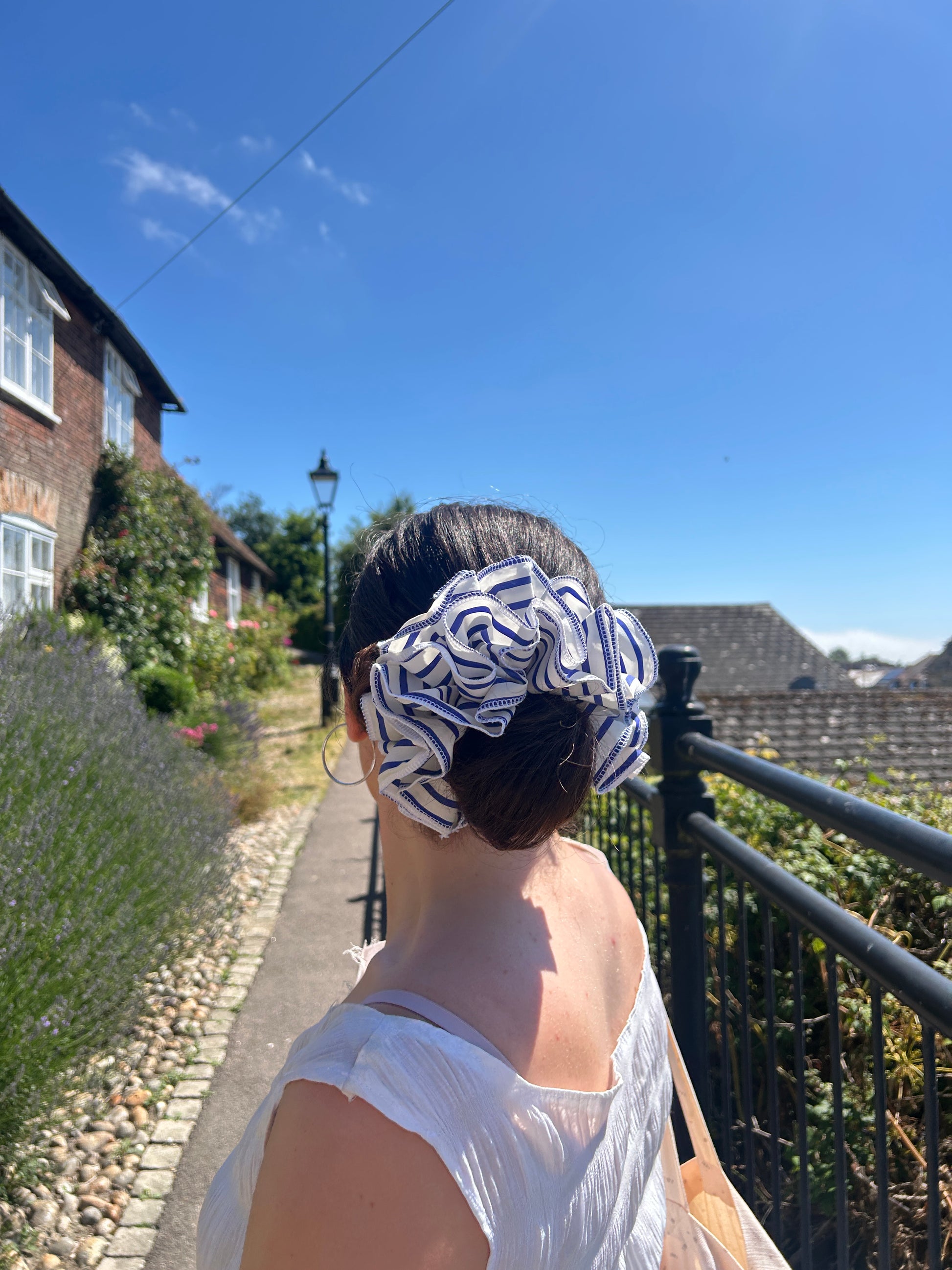 Blue and White Cotton Sateen Scrunchie with overlock stitch.
